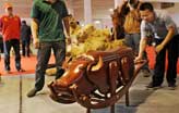 Wu Dingwu lifts and presses a U-shaped handle attached to an exquisitely carved wooden ox, and it starts clip-clopping forward.