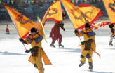 People dressed in the Qing Dynasty (1644 -1911) royal costumes play "Bingxi," or ice game, on a frozen lake in the Old Summer Palace in Beijing, Jan 26, 2011.