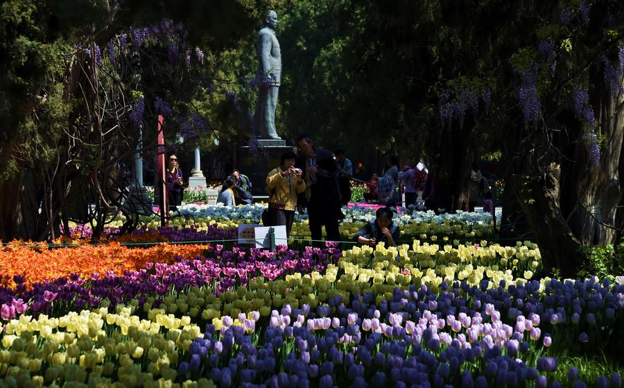 | People take photos of tulip at the Zhongshan Park in Beijing, capital of China, April 20, 2016.[Photo/Xinhua] |