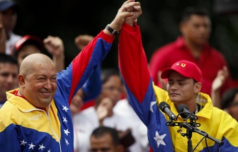 Venezuela's President Hugo Chavez (L) holds a student's hand during a rally celebrating the university students' day in Caracas November 21, 2011.