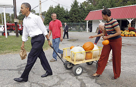 US President Barack Obama and first lady Michelle Obama pick Halloween pumpkins at Wood's Orchard in Hampton, Virginia, October 19, 2011.