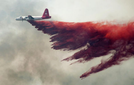 A Cal Fire aircraft drops flame retardant on the Topaz Ranch Estates Fire in Wellington, Nevada May 23, 2012. Evacuations were lifted today as the fire moved north into the canyons.