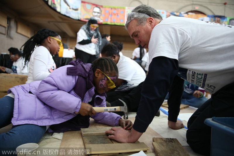 Frank Monaghan, executive director of Habitat for Humanity, right, helps Janai Wright, 9, left, build a flower box during 20th annual Greater Philadelphia Martin Luther King Day of Service on Jan 19, 2015 at Girard College in Philadelphia. [Photo/IC]