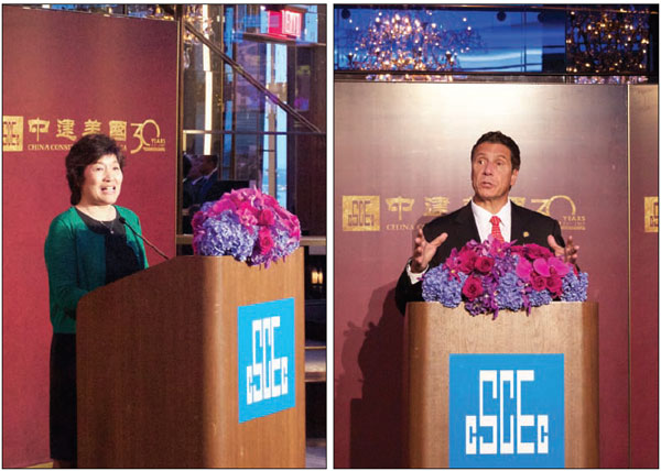 | Zhang Qiyue (left), Chinese consul general in New York, addresses China Construction America's 30th anniversary dinner reception at the Rainbow Room atop 30 Rockefeller Plaza in Manhattan on Monday. New York Governor Andrew Cuomo called the company "a phenomenal success story" and praised its timely completion of building projects. Hong Xiao / For China Daily |