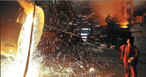 | A worker cleans a steel lendle at the Dongbei Special Steel Group in Dalian, Liaoning province.Liu Debin / For China Daily |