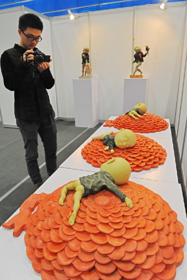 A visitor enjoys art at the7th China Culture, Art Display and Trade Fair in Weifang, East China's Shandong province, April 18, 2014.[Photo by Wang Jilin/asianewsphoto] |
